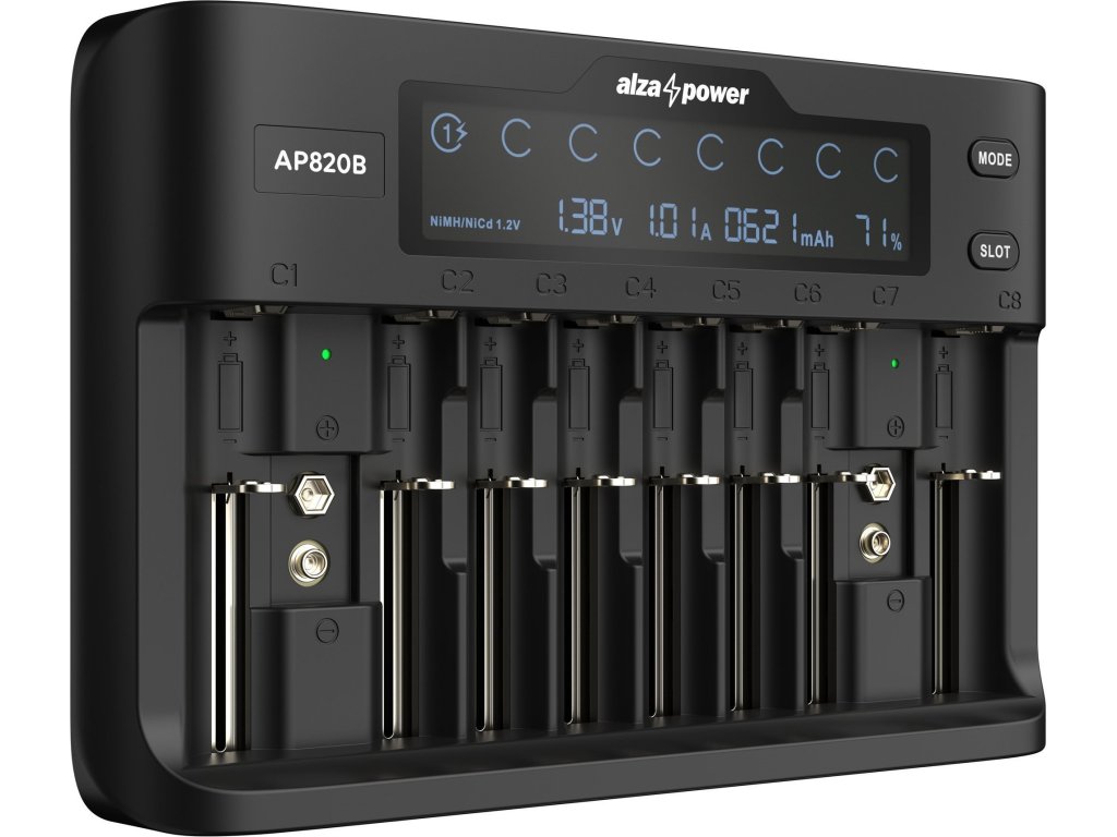 Nabíječka baterií pro AA/AAA akumulátory, NiMH a NiCd, Ni-Mh, Li-ion 18650, LiFePo4,nabíjecí proud 2A (max), 4Safe - ochrana proti zkratu, přepětí, přetížení a přehřátí, podpora rychlého nabíjení a chytrého nabíjení, spotřeba 36W (max), adaptér do sítě součástí balení Nabíjejte rychle a bezpečně s AlzaPower Představujeme vám výkonnou nabíječku baterií AlzaPower Battery Charger AP820B, pomocí které nabijete širokou škálu NiMH či NiCd baterií – AA, AAA, AAAA, C, SC a 9V ploché či Li-Ion akumulátory typu 18650 apod. U naší nabíječky si můžete vybrat nabíjecí proud a zvolit můžete i rychlonabíjení 2 A pro Li-Ion a max. 1 A pro NiMH a NiCd baterie. Dále pak oceníte její malé rozměry, nízkou hmotnost a jednoduchost používání. PraktickýLCD displej Nabíječku baterií jsme osadili přehledným LCD displejem, který zobrazuje údaje jako např. typ baterie, napětí, pořadové číslo slotu, proud, kapacitu a stav nabíjení v procentech. K ovládání AP820B slouží dvě tlačítka (SLOT a MODE). Bezpečnostna prvním místě Nezapomněli jsme ani na automatické ukončení dobíjení v okamžiku plného dobití, díky čemuž nedojde k přebití baterií. Samozřejmostí je poté ochrana proti opačné polaritě, zkratu a přepětí. Do balení jsme kromě nabíječky přidali také síťový adaptér. Go green with Alza Jsme šetrní k životnímu prostředí, a proto naše produkty dodáváme v recyklovatelném frustration-free balení. Buďte green s AlzaPower. Rodina produktů AlzaPower Produkty AlzaPower jsme navrhovali tak, aby splňovaly nejvyšší standardy. I díky tomu můžeme garantovat špičkovou kvalitu každého jednotlivého produktu a poskytnout nadstandardní služby. Proto vám v případě závady u většiny našich produktů nabízíme okamžitou výměnu za nový kus, a to na všech pobočkách. Detailní specifikace Vstupní napětí:DC 12 V / 3 AVýstup:1,2 V NiMH / NiCd – 8 ks × 1,48 V / 0,2 A / 0,5 A / 0,8 A / 1 A3,2 V LiFePo4 – 8 ks × 3,65 V / 0,2 A / 0,5 A / 0,8 A nebo 6 ks × 1 A nebo 2 ks × 2 A (slot 1 & 8)3,6 / 3,7 V Li-Ion – 8 ks × 4,20 V / 0,2 A / 0,5 A / 0,8 A nebo 6 ks × 1 A nebo 2 ks × 2 A (slot 1 & 8)3,85 V Li-Ion – 8 ks × 4,35 V / 0,2 A / 0,5 A / 0,8 A nebo 6 ks × 1 A nebo 2 ks × 2 A (slot 1 & 8)9 V NiMH / Li-Ion / LiFePo4 – 2 ks × 60 mA Kompatibilita: – 3,2 V LiFePO4 & 3,6 / 3,7 / 3,85 V Li-Ion: 10340 / 14500 / 16340 (RCR123A) / 17500 / 17650 / 17670 / 18490 / 18500 / 18650 / 20700 / 21700 / 22650 / 26500 / 26650 atd.– 1,2 V NiMH a NiCd: A, AA, AAA, AAAA, C, SCLCD display zobrazuje: typ baterie, napětí, pořadové číslo slotu, proud, kapacitu, stav nabíjení v %Automatické ukončení dobíjení přesně v okamžiku plného dobití, aby nedošlo k přebití bateriíMožnost výběru nabíjecího prouduRychlonabíjení (max. 2 A pro Li-Ion / LiFePO4 baterie & max. 1 A pro NiMH a NiCd baterie)Každý SLOT ukazuje stav nabíjení samostatněAutomatické vypnutí jako ochrana proti opačné polaritě, zkratu a přepětíMalé rozměry, lehká, přenosná a jednoduchá na používáníSíťový adaptér je součástí baleníOvládání pomocí tlačítek SLOT a MODEMaximální spotřeba: 36 WDoplňkové parametry