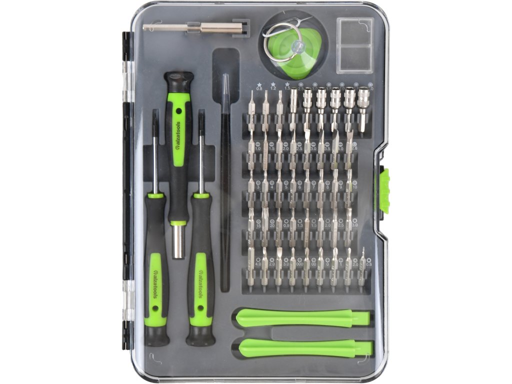 Sada šroubováků - obsahuje 36 jemných bitů z chrom-vanadové oceli, 6 nástrčných hlavic, 2 šroubováky, magnetický držák bitů s ergonomickou rukojetí, nástavec držáku, pinzetu, otevírací páčidla, přísavku, pin na SIM kartu, trojúhelníkové páčidlo, krabičku na šroubky a plastový box s průhledným víkem Skvěle vybavená 52dílná sada pro všestranné využitíSada AlzaTools Precision Repair Set obsahuje celkem 52 kusů nářadí – kromě 36 bitů, 6 nástrčných hlavic, dvou šroubováků a další příslušenství v podobě magnetického držáku bitů s rukojetí, nástavce držáku, pinzety, otevíracích páčidel, přísavky, pinu na SIM kartu, trojúhelníkového páčidla a krabičky na šroubky. Využijete ji především pro opravy drobné elektroniky, zejména poté mobilních telefonů a Apple zařízení. Skvěle se hodí i pro hodinařinu, modelářství, opravy dětských hraček a další. Bity jsou vyrobené z kvalitní chrom-vanadové oceli a vše je přehledně uložené v plastovém boxu. Odolné provedení a praktický úložný boxBity a šroubováky AlzaTools Precision Bit Set jsou vyrobené z kvalitní vysokopevnostní chrom-vanadové oceli, která zaručuje vysokou odolnost a dlouhou životnost. Všechno nářadí je přehledně uložené v transparentním plastovém boxu s pojistkou proti otevření. Detailní specifikace sady AlzaTools Precision Repair Set 52 PCS52dílná sada nářadí pro všestranné využitíV balení 36 jemných bitů, 6 nástrčných hlavic, magnetický držák bitů s rukojetí, nástavec držáku, 2 šroubováky (křížový PH00, Pentalobe 0,8), pinzeta, otevírací páčidla, přísavka, pin na SIM kartu, trojúhelníkové páčidlo a krabička na šroubkyPentalobe bity pro opravy Apple zařízeníVše přehledně uloženo v plastovém boxu s průhledným víkemBity vyrobené z kvalitní CrV oceliSada obsahuje bity:ploché (1; 1,5; 2,0; 2,5; 3,0; 3,5; 4,0 mm)křížové PH (000; 00; 0; 1)Torx (T-3; T-4; T-5; T-6; T-7; T-8; T-9; T-10; T-15; T-20)Imbusové (0,9; 1,3; 1,5; 2,0; 2,5; 3,0; 4,0 mm)Triangle (2,0; 3,0)Tri-wing (Y2,0)U (U2,6)Oval (R0,8)Pentalobe (0,8; 1,2; 1,5 mm)Doplňkové parametry