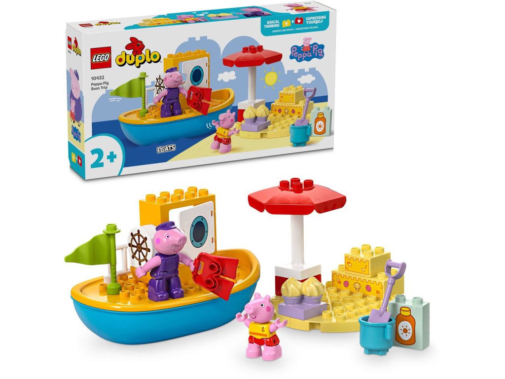 LEGO stavebnice - pro děti, vhodné od 2 let, řada LEGO® DUPLO®, rok uvedení 2024, balení obsahuje 23 dílků LEGO® DUPLO® 10432 Prasátko Peppa a výlet na loďceLEGO® vodní dobrodružstvíČeká tě příjemný den u vody. Přidej se k Peppě a jejímu dědečkovi a vyrazte společně na loď a na pláž.Velké LEGO® kostky, velká zábavaVelké LEGO® kostky skvěle padnou do dětských rukou a stavění tak bude úžasná zábava. Loďka drží na voděLoďka z této stavebnice LEGO® opravdu plave, a tak se skvěle hodí třeba pro večerní zábavu ve vaně.23kostek2+doporučený věkNávodje součástí baleníLEGO® DUPLO® 10432 Prasátko Peppa a výlet na loďceDědeček Prasátko se už nemůže dočkat, až Peppě ukáže svou loď. Přidej se k nim a nech se od dědečka proškolit, jak se takováto loďka kormidluje. Pak si nasaď ploutve a vydej se prozkoumat svět pod hladinou.Práce na zahraděJe čas na odpočinek? Uvažte s Peppou loďku u pláže a schrupněte si pod slunečníkem. Pak můžete postavit hrad z písku a ozdobit ho mušlemi. Nezapomeňte se ale namazat opalovacím krémem, sluníčko opravdu pálí! Loďka z této stavebnice LEGO® drží na vodě, a tak si ji děti mohou vzít s sebou třeba do vany.LEGO® DUPLO®LEGO® DUPLO® je nekonečným zdrojem tvořivé zábavy pro všechny malé nezbedy od 1,5 až do 3 let. Kostky jsou speciálně navrženy tak, aby skvěle padly do malých ruček a aby byly zároveň absolutně bezpečné.Ostatní vlastnosti LEGO® DUPLO® 10432 Prasátko Peppa a výlet na loďce Zábavná tvořivá LEGO® hra Trénuje jemnou motoriku, představivost a fantazii LEGO® DUPLO® splňuje nejpřísnější normy bezpečnosti Kvalitní provedení padnoucí do malých dětských rukouObsah balení stavebnice LEGO: Pláž se slunečníkem Loď 2 figurky: Peppa a dědeček Doplňky NávodRozměry modelu:11 × 12 × 18 cmDoplňkové parametry