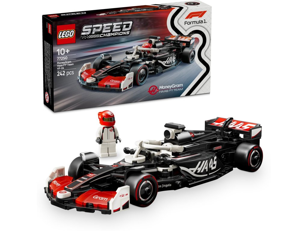 LEGO stavebnice - pro děti, vhodné od 10 let, řada LEGO® Speed Champions, rok uvedení 2025, balení obsahuje 242 dílků LEGO® Speed ChampionsZávodní auto MoneyGram Haas F1® Team VF-24Fanoušci F1® a děti od 10 let si postaví a vystaví závodní model MoneyGram Haas F1® Team VF-24Na děti od 10 let čeká stavitelský zážitek, na jehož konci se mohou těšit na model závodního auta MoneyGram Haas F1® Team VF-24. Ideální je na hraní i vystavení. Nabízí mnoho detailů inspirovaných skutečným vozem, který se zúčastnil Mistrovství světa Formule 1 v roce 2024. LEGO® Speed Champions 77250 Závodní auto MoneyGram Haas F1® Team VF-24 Model vozu MoneyGram Haas F1® Team VF-24 disponuje kokpitem, který lze otevřít zvednutím svatozáře, zadním křídlem, rovnoběžníkovou nápravou, polepy sponzorů a širšími zadními pneumatikami s nápisem „Pirelli“. Stavebnice obsahuje také minifigurku jezdce v outfitu MoneyGram Haas F1 Team s okřídlenou helmou, kterou děti usadí za volant a vydají se s ní na strhující závody.Při stavění modelu vozu děti využijí aplikaci LEGO Builder, která jim se stavěním pomůže.Propracovaný vůz MoneyGram HaasModel vozu F1 vyniká designovými detaily inspirovanými skutečným vozem z roku 2024, a to včetně svatozáře, zadního křídla, polepů sponzorů a širších zadních pneumatik s nápisem „Pirelli“.Ideální pro děti od 10 letStavebnice se skládá z 242 dílků a model závodního auta MoneyGram Haas F1® Team měří přes 4 cm na výšku, 20 cm na délku a 7 cm na šířku. Ideální je pro děti od 10 let.Minifigurka řidičeStavebnice obsahuje minifigurku řidiče v outfitu týmu MoneyGram Haas F1® s okřídlenou helmou, kterou děti posadí za volant a uspořádají s ní napínavé závody.LEGO® Speed Champions - LEGO Speed Champions propojuje svět stavebnice a závodních aut těch nejprestižnějších značek. Můžete si tak užívat atmosféru závodů - realistická autíčka, burácení motorů, rychlost a touha po vítězství. Na hraní i na výstavkuJakmile děti model automobilu MoneyGram Haas F1® Team VF-24 dostaví, mohou se s ním pustit na závodní dráhu. A až si dohrají, bude se vyjímat na jejich výstavce.3D návod na stavěníStavění dětem usnadní aplikace LEGO Builder, která umožňuje přibližovat a otáčet modely ve 3D a sledovat postup pomocí digitálního návodu.Ikonická autaSe stavebnicemi LEGO® Speed Champions si děti a milovníci aut postaví repliky těch nejslavnějších vozů na světě.Ostatní vlastnosti LEGO stavebnice LEGO® Speed Champions 77250 Závodní auto MoneyGram Haas F1® Team VF-24Stavebnice určená pro všechny příznivce rychlých autRozvíjí kreativitu a podporuje fantaziiProcvičuje jemnou motorikuNabízí vzrušující svět závodních autVelmi kvalitní zpracováníObsah baleníKostky k sestaveníMinifigurka řidičeNávodDalší stavebnice z řady LEGO® Speed ChampionsPokud toto zboží rozbalíte a následně vrátíte, může vám být vrácená částka ponížena.Více zdeDoplňkové parametry