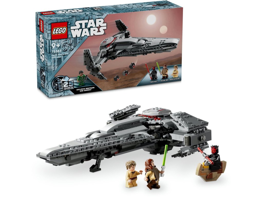 LEGO stavebnice - pro děti, vhodné od 9 let, řada LEGO® Star Wars, rok uvedení 2024, balení obsahuje 640 dílků LEGO® Star Wars™ 75383 Sith Infiltrator™ Dartha MaulaDávej si pozorDarth Maul se ve svém Sith Infiltratoru snaží dopadnout Qui-Gon Jinna! Dávej si pozor na jeho vystřelovače.Droidi vyskakují z lodiZ lodě vyskakují průzkumní droidi DRK-1, akce pokračuje také na zemi se spídrem Bloodfin Dartha Maula.Pro příznivce Hvězdných válekLEGO® Star Wars tě přenese do světa Hvězdných válek, kde můžeš bojovat proti Temné straně Síly.640kostek9+doporučený věkNávodsoučástí baleníLEGO® Star Wars™ 75383 Sith Infiltrator™ Dartha MaulaSpoj své síly s Anakinem Skywalkerem a použij Qui-Gon Jinnův světelný meč, který ti v boji proti Darthovi Maulovi jistě pomůže. Podaří se ti mocného sithského droida porazit?Sith Infiltrator tě nadchneModel hvězdné lodi Sith Infiltrator tě nadchne. Rozlož křídla a zasuň podvozek, aby loď mohla vyletět. Vystřelit můžeš také ze 2 pružinových vystřelovačů. Když stiskneš spoušť, vypustíš z přední přihrádky průzkumné droidy DRK-1. Čeká na tebe skvělá akce a dobrodružství.LEGO® Star Wars™LEGO® Star Wars™ je skvělá zábava pro malé i velké příznivce této nesmrtelné ságy. V mžiku tě přenese do legendárního světa Hvězdných válek, kde můžeš bojovat proti Temné straně Síly. Čeká na tebe mnoho akce a dobrodružství!Ostatní vlastnosti LEGO® Star Wars™ 75383 Sith Infiltrator™ Dartha Maula Stavebnice určená pro všechny příznivce Hvězdných válek Nabízí spoustu akce a dobrodružství Rozvíjí kreativitu a podporuje fantazii Procvičuje jemnou motoriku Skvělá zábava pro děti i dospěléObsah balení stavebnice LEGO: Kostky k sestavení 4 minifigurky - Darth Maul, Anakin Skywalker, Qui-Gon Jinn a LEGO Saw Gerrery NávodRozměry: 27 × 20 × 7 cmDoplňkové parametry