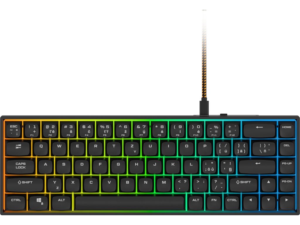 Herní klávesnice - drátová, 65% formát (68 kláves), RGB podsvícení, magnetické spínače Gateron Dual-Rail White, životnost až 150 milionů kliknutí, lubrikované stabilizéry, PBT keycapy s XDA profilem, zámek tlačítka Windows, N-Key rollover, ANSI layout s CZ/SK lokalizací, odnímatelný opletený USB-C kabel (1,6 m), software v češtině, key puller HERNÍ KLÁVESNICE RAPTURE CHARLIE V2 HEKompaktní síla s magnetickou přesností!Drátová herní klávesnice Rapture CHARLIE V2 HE v 65% formátu dokazuje, že i malá klávesnice může nabídnout špičkový výkon. Díky magnetickým spínačům Gateron Dual-Rail White se dočkáte okamžité odezvy, plynulého lineárního chodu a naprosto přesných reakcí v každé situaci. Odolné PBT klávesy s XDA profilem si zachovají dokonalý povrch i po tisících herních hodin. O atmosféru se postará RGB podsvícení s množstvím efektů, které vašemu setupu dodá styl i herní náladu. Software v češtině poté umožní kompletní přizpůsobení klávesnice podle vašich potřeb.TECHNICKÉ SPECIFIKACEGateron Dual-Rail WhiteTYP SPÍNAČŮPBT, neprůsvitnéKEYCAPYXDAPROFIL150 milionů stisknutíŽIVOTNOST SPÍNAČŮ8 000 HzPOLLING RATEUSB-CPŘIPOJENÍpřizpůsobitelnáAKTIVAČNÍ DRÁHACZ / SKLOKALIZACE65% (68 kláves)FORMÁTANSILAYOUTČÍM VÁS HERNÍ KLÁVESNICE RAPTURE CHARLIE V2 HE PŘEKVAPÍGATERON DUAL-RAIL WHITERychlost, přesnost a dlouhá životnostSrdcem klávesnice Rapture CHARLIE V2 HE jsou pokročilé magnetické spínače Gateron Dual-Rail White s životností až 150 milionů stisků a navržené pro maximální přesnost a bleskovou odezvu. Díky lineárnímu chodu a nastavitelnému aktivačnímu bodu reagují přesně tak, jak potřebujete – ať už píšete, nebo hrajete na hraně možností. Dvoukolejnicová konstrukce zajišťuje dokonale stabilní stisk bez kývání kláves, zatímco ultralehká aktivační síla 30 g snižuje únavu i při dlouhých herních seancích. Stabilizátory jsou lubrikované, tudíž delší klávesy, jako je mezerník či Enter, zůstávají naprosto stabilní a bez nežádoucího klapání.POKROČILÉ FUNKCEPro absolutní kontroluKlávesnice podporuje pokročilé funkce posouvající herní i pracovní zážitek na úplně novou úroveň. Technologie Rapid Trigger umožňuje okamžitou deaktivaci a opětovnou aktivaci klávesy, takže každý váš pohyb se promítne do hry bez prodlevy. Funkce DKS (Dynamic Keystroke) dovoluje přiřadit různé akce podle hloubky stisku, zatímco MT (Mod-Tap) rozlišuje mezi krátkým a dlouhým stiskem. Nechybí ani TGL (Toggle) – přepínací funkce aktivovaná v určité hloubce stisku. Tyto možnosti přinášejí naprostou svobodu přizpůsobení a zajišťují bleskově rychlou a přesnou odezvu, která vám poskytne konkurenční výhodu při hraní i náročné práci.SKUTEČNĚ KOMPAKTNÍ KLÁVESNICE68 klávesRapture CHARLIE V2 HE sází na 65% rozložení bez numerické části i funkční řady – na stole vám tak zbyde víc prostoru pro přesné pohyby myší. I přes své menší rozměry nabízí 68 kláves v ANSI layoutu s CZ/SK znaky, takže si zachovává plnou použitelnost při hraní i psaní. Odolné PBT klávesy s XDA profilem zaručují příjemný pocit při stisku a dlouhou životnost bez lesknutí. Samozřejmostí je zámek klávesy Windows, který vás ochrání před nechtěným stiskem v rozhodujícím momentu – díky tomu zůstanete ve hře, ať se děje cokoli.SOFTWARE RAPTURENastavte si barvy, makra i funkce podle vlastního styluKaždý hráč má svůj styl – a klávesnice Rapture CHARLIE V2 HE se mu díky softwaru dokonale přizpůsobí. Můžete si nastavit makra, funkce kláves, RGB podsvícení a mnoho dalšího podle svých preferencí, abyste měli každý detail pod naprostou kontrolou. Funkce 100% anti-ghosting a N-key rollover zajišťují spolehlivou registraci každého stisku i při složitých kombinacích. Pomocí výklopných nožiček snadno nastavíte optimální sklon pro pohodlné hraní i psaní.DYNAMICKÉ RGB PODSVÍCENÍPro pohlcující herní atmosféruNechte se vtáhnout do hry působivým RGB podsvícením se širokou nabídkou efektů, barev a přechodů. Podsvícení dokáže být decentní i výrazné, čímž se perfektně přizpůsobí jak večernímu hraní, tak každodennímu používání. Výsledkem je stylová klávesnice se špičkovým výkonem i atmosférou, která vás naladí na vítězství.PLUG AND PLAYŽádná složitá instalaceK počítači připojíte Rapture CHARLIE V2 HE pomocí 1,6 metru dlouhého opleteného kabelu s konektorem USB-C. Klávesnice nabízí plnou podporu Plug & Play – stačí ji zapojit a okamžitě funguje bez nutnosti instalace ovladačů. Součástí balení je i key puller umožňující bezpečné vyjmutí kláves bez rizika poškození.Doplňkové parametry
