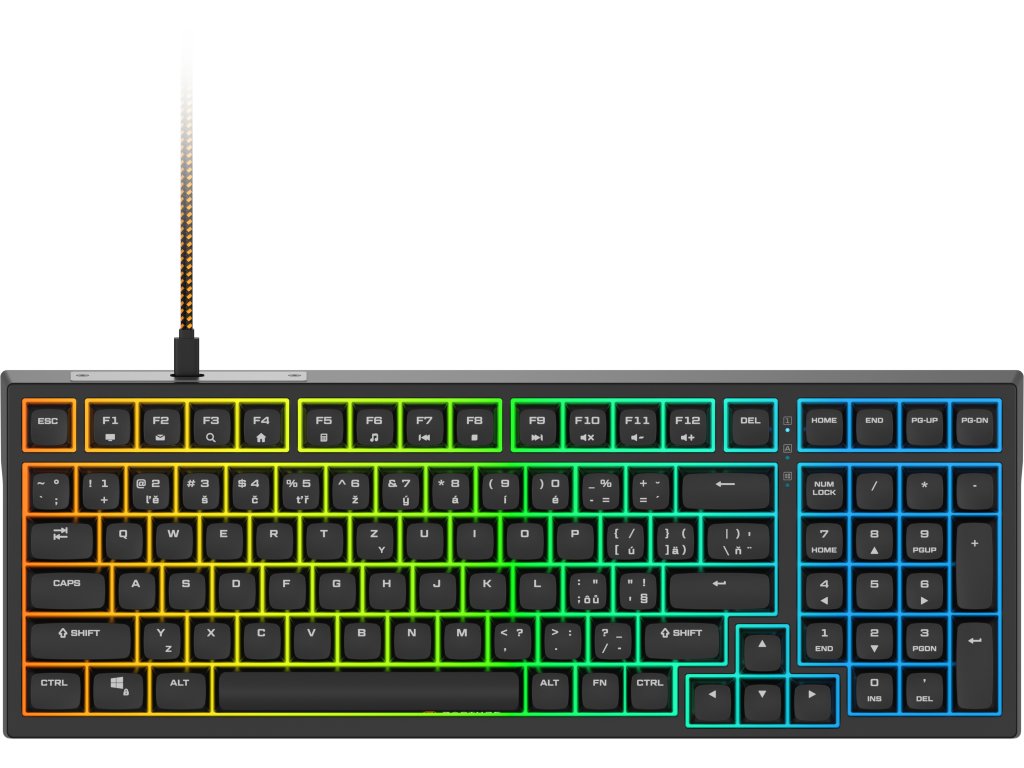 Herní klávesnice - drátová, 98% formát (99 kláves), RGB podsvícení, magnetické spínače Gateron Dual-Rail White, životnost až 150 milionů kliknutí, lubrikované stabilizéry, PBT keycapy s XDA profilem, zámek tlačítka Windows, N-Key rollover, 12 multimediálních kláves (přes klávesu Fn), ANSI layout s CZ/SK lokalizací, odnímatelný opletený USB-C kabel (1,6 m), software v češtině, key puller HERNÍ KLÁVESNICE RAPTURE FOXTROT HEKaždý stisk pod vaší kontrolou!Drátová klávesnice Rapture FOXTROT HE v 98% formátu kombinuje kompaktní rozložení se špičkovou technologií magnetických spínačů Gateron Dual-Rail White, které nabízejí bleskovou odezvu, hladký lineární stisk a nastavitelný aktivační bod pro absolutní kontrolu při hraní i psaní. Prémiové PBT keycapy s XDA profilem zajišťují perfektní pocit při každém dotyku, zatímco gasket mount konstrukce s víceúrovňovým tlumením efektivně pohlcuje vibrace a dodává klávesnici měkký, tlumený zvuk. Nechybí RGB podsvícení, lubrikované stabilizátory ani opletený USB-C kabel. Software v češtině poté umožní kompletní přizpůsobení klávesnice podle vašich potřeb.TECHNICKÉ SPECIFIKACEGateron Dual-Rail WhiteTYP SPÍNAČŮPTB, neprůsvitnéKEYCAPYXDAPROFIL150 milionů stisknutíŽIVOTNOST SPÍNAČŮ8 000 HzPOLLING RATEUSB-CPŘIPOJENÍ12MULTIMEDIÁLNÍ KLÁVESYCZ / SKLOKALIZACE98% (99 kláves)FORMÁTpřizpůsobitelnáAKTIVAČNÍ DRÁHAČÍM VÁS HERNÍ KLÁVESNICE RAPTURE FOXTROT HE PŘEKVAPÍGATERON DUAL-RAIL WHITERychlost, přesnost a dlouhá životnostSrdcem klávesnice Rapture FOXTROT HE jsou pokročilé magnetické spínače Gateron Dual-Rail White s životností až 150 milionů stisků a navržené pro maximální přesnost a bleskovou odezvu. Díky lineárnímu chodu a nastavitelnému aktivačnímu bodu reagují přesně tak, jak potřebujete – ať už píšete, nebo hrajete na hraně možností. Dvoukolejnicová konstrukce zajišťuje dokonale stabilní stisk bez kývání kláves, zatímco ultralehká aktivační síla 30 g snižuje únavu i při dlouhých herních seancích. Stabilizátory jsou lubrikované, tudíž delší klávesy, jako je mezerník či Enter, zůstávají naprosto stabilní a bez nežádoucího klapání.POKROČILÉ FUNKCEPro absolutní kontroluKlávesnice podporuje pokročilé funkce posouvající herní i pracovní zážitek na úplně novou úroveň. Technologie Rapid Trigger umožňuje okamžitou deaktivaci a opětovnou aktivaci klávesy, takže každý váš pohyb se promítne do hry bez prodlevy. Funkce DKS (Dynamic Keystroke) dovoluje přiřadit různé akce podle hloubky stisku, zatímco MT (Mod-Tap) rozlišuje mezi krátkým a dlouhým stiskem. Nechybí ani TGL (Toggle) – přepínací funkce aktivovaná v určité hloubce stisku. Tyto možnosti přinášejí naprostou svobodu přizpůsobení a zajišťují bleskově rychlou a přesnou odezvu, která vám poskytne konkurenční výhodu při hraní i náročné práci.EFEKTIVNÍ ROZLOŽENÍVšechny klávesy, co potřebujetePlnohodnotné 98% rozložení kombinuje všechny důležité klávesy v prostorově úspornějším těle. Celkem 99 kláves v ANSI layoutu s CZ/SK znaky zaručuje pohodlné psaní i hraní bez nutnosti dělat kompromisy. Odolné PBT keycapy s XDA profilem poskytují příjemný pocit při stisku a dlouhou životnost bez lesknutí povrchu. Nechybí ani 12 multimediálních kláves (Fn + F1–F12) pro rychlý přístup k ovládání hudby, hlasitosti, kalkulačky či webového prohlížeče. Praktická funkce Win Lock zabrání nechtěnému stisku klávesy Windows v rozhodujícím okamžiku.GASKET MOUNTPro měkký a tichý stiskZážitek z hraní umocňuje speciální konstrukce s pružným uložením desky, která je oddělena od horní a spodní části těla tenkými tlumicími vložkami. Ty při stisku kláves pohlcují rázy a vibrace, takže psaní i hraní působí měkčeji, klidněji a s výrazně tišším zvukem. Uvnitř se nachází několik vrstev pěnového odhlučnění, jež dále zjemňují dopad kláves a zvyšují celkový komfort. Výsledkem je pevná, ale přitom příjemně pružná konstrukce poskytující jistý stisk bez tvrdých nárazů. Tuto technologii oceníte nejen při dlouhých herních seancích, ale i při každodenním psaní – přináší totiž menší únavu prstů a celkově příjemnější pocit z používání.SOFTWARE RAPTURENastavte si barvy, makra i funkce podle vlastního styluKaždý hráč má svůj styl – a klávesnice Rapture FOXTROT HE se mu díky softwaru dokonale přizpůsobí. Můžete si nastavit makra, funkce kláves, RGB podsvícení a mnoho dalšího podle svých preferencí, abyste měli každý detail pod naprostou kontrolou. Klávesnice nabízí 100% anti-ghosting a N-key rollover zaručující spolehlivou registraci každého stisku i při složitých kombinacích. Pomocí výklopných nožiček snadno nastavíte optimální sklon pro pohodlné hraní i psaní.DYNAMICKÉ RGB PODSVÍCENÍPro pohlcující herní atmosféruKlávesnice Rapture FOXTROT HE nabízí působivé RGB podsvícení se širokou škálou efektů, barev a přechodů, které si snadno přizpůsobíte podle svých představ. Podsvícení působí elegantně i dynamicky a perfektně doplní zbytek vašeho herního setu. K počítači klávesnici připojíte pomocí 1,6 metru dlouhého opleteného USB-C kabelu, přičemž instalace je zcela Plug & Play – stačí připojit a můžete hrát. Součástí balení je i key puller umožňující bezpečné vyjmutí kláves bez rizika poškození.Doplňkové parametry