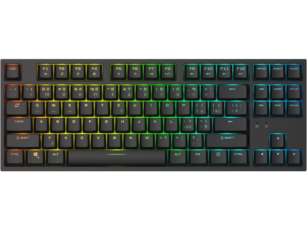 Herní klávesnice - drátová i bezdrátová USB kabel, 2,4 GHz a 3× Bluetooth, mechanická, formát TKL tenkeyless, 87 kláves, RGB podsvícení, mechanické lineární spínače Kailh White Rain LP, předlubrikované, životnost až 50 milionů kliknutí, nízkoprofilové průsvitné ABS keycapy, zámek tlačítka Windows, N-Key rollover, vestavěná dobíjecí baterie Li-Ion 2 000 mAh, česká a slovenská lokalizace, 12 multimediálích kláves, opletený kabel 1,6 m, port USB-C, přepínání mezi Windows a macOS HERNÍ KLÁVESNICE RAPTURE TANGOTKL klávesnice pro hráče, kteří chtějí styl i výkon!Bezdrátová herní klávesnice Rapture TANGO v provedení TKL (tenkeyless) představuje ideální volbu pro hráče požadující vysoký výkon v kompaktním těle bez numerického bloku. Nízkoprofilové lineární spínače Kailh White Rain LP nabízejí mimořádně hladký a rychlý stisk s přesnou odezvou. O stylový vzhled se stará dynamické RGB podsvícení, které dodá hernímu setupu jedinečný charakter. Klávesnici lze připojit bezdrátově přes 2,4GHz adaptér, až ke třem zařízením přes Bluetooth, nebo klasicky pomocí kabelu. Vestavěná baterie s dlouhou výdrží zvládne i náročné herní maratony, zatímco nízkoprofilové ABS klávesy poskytují jistý a pohodlný stisk. Nechybí ani vlastní software v češtině umožňující detailní nastavení funkcí či maker podle osobních preferencí. TECHNICKÉ SPECIFIKACE Kailh White Rain LP TYP SPÍNAČŮ ABS, průsvitné KEYCAPY ANSI ROZLOŽENÍ 50 milionů stisknutí ŽIVOTNOST SPÍNAČŮ RGB PODSVÍCENÍ 2 000 mAh KAPACITA BATERIE 2,8 mm AKTIVAČNÍ DRÁHA CZ / SK LOKALIZACE TKL (87 kláves) FORMÁT 2,4 GHz, 3× BT a USB PŘIPOJENÍ ČÍM VÁS HERNÍ KLÁVESNICE RAPTURE TANGO PŘEKVAPÍ KAILH WHITE RAIN LPLineární mechanické spínačeTenkeyless klávesnice Rapture TANGO je osazena nízkoprofilovými spínači Kailh White Rain LP nabízejícími lineární charakteristiku s hladkým a tichým chodem bez hmatového odporu. Díky krátkému aktivačnímu bodu 1,2 mm a celkové dráze stisku 2,8 mm reagují neobyčejně rychle, což ocení hráči při intenzivních akcích i ti, kteří vyžadují svižné psaní. Spínače mají životnost až 50 milionů stisků, což zaručuje dlouhodobou spolehlivost. Z výroby jsou předlubrikované, dochází tak k nižšímu tření mezi jednotlivými částmi a spínače mají mnohem tišší a plynulejší chod. KOMPAKTNÍ KLÁVESNICE87 nízkoprofilových klávesDíky průsvitným ABS keycapům skvěle vynikne RGB podsvícení, které dodá klávesnici výrazný herní vzhled i osobitý styl. TKL rozložení (tenkeyless) s 87 % velikostí bez numerického bloku poskytuje více prostoru pro myš, a přitom zachovává všechny důležité klávesy pro hraní i práci. ANSI formát s dlouhým levým Shiftem a úzkým Enterem je přehledný, univerzální a oblíbený mezi hráči i profesionály. Nízký profil kláves pak zajišťuje pohodlné psaní, rychlé reakce a menší únavu i při dlouhých herních seancích. DYNAMICKÉ RGB PODSVÍCENÍPro pohlcující herní atmosféruS Rapture TANGO si snadno přizpůsobíte RGB podsvícení přesně podle svého stylu. K dispozici je několik efektů, možnost změny barvy, jasu i rychlosti, takže si klávesnici dokonale sladíte se svým herním setem. Jednoduché ovládání pomocí klávesových zkratek umožní rychle měnit nastavení i během hry – ať už chcete decentní podsvícení, nebo dynamickou světelnou show. SNADNÉ PŘEPÍNÁNÍ MEZI OPERAČNÍMI SYSTÉMYKompatibilní s Windows i macOSKlávesnice je plně kompatibilní se systémy Windows i macOS, takže ji lze bez problémů používat na jakémkoli zařízení (přepínání pomocí Fn a příslušných kláves). Rapture TANGO nabízí 12 multimediálních kláves (F1–F12), které umožňují rychlý přístup k nejpoužívanějším funkcím, jako je ovládání hlasitosti, přehrávání médií nebo nastavení jasu. V systému macOS lze navíc nastavit, zda budou klávesy v horní řadě fungovat jako funkční, nebo jako multimediální, takže si rozložení snadno přizpůsobíte svým zvyklostem. ŠIROKÉ MOŽNOSTI PŘIPOJENÍPřipojte klávesnici hned k několika zařízením najednouHerní TKL klávesnice Rapture TANGO je vybavena integrovanou dobíjecí baterií (2 000 mAh), tudíž nemusíte myslet na výměnu baterií a pohodlně ji dobijete pomocí dodávaného 1,6 metru dlouhého opleteného kabelu. Klávesnici můžete připojit k počítači jak bezdrátově, tak i prostřednictvím tohoto kabelu. Součástí je 2,4GHz USB přijímač a k připojení lze využít i Bluetooth až pro tři zařízení a libovolně mezi nimi přepínat. Plug & Play značí, že nemusíte nic zdlouhavě nastavovat nebo instalovat ovladače. Součástí balení je kombinovaný key / switch puller.Doplňkové parametry