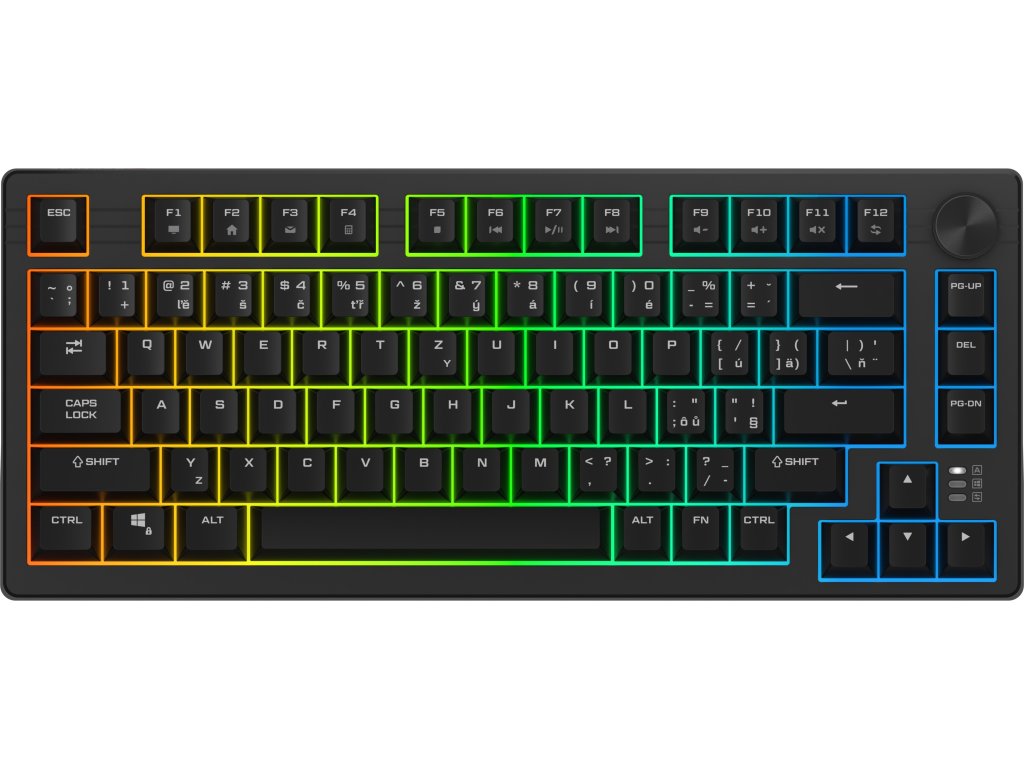 Herní klávesnice - drátová, 75% formát (80 kláves), RGB podsvícení (45 režimů), magnetické spínače Kailh Mistral, životnost až 100 milionů kliknutí, PBT keycapy s Cherry profilem, zámek tlačítka Windows, N-Key rollover, 12 multimediálních kláves (přes klávesu Fn), kolečko pro ovládání hlasitosti, ANSI layout s CZ/SK lokalizací, odnímatelný opletený kabel (1,8 m), software v češtině HERNÍ KLÁVESNICE REPTURE VICTOR HEKompaktní rozměry, maximální herní výkon!Tahle klávesnice přináší to nejlepší z obou světů – kompaktní 75% layout šetří místo na stole, a přesto nabízí všechny potřebné klávesy. Díky ANSI rozložení s českými a slovenskými znaky je připravená na každodenní použití bez kompromisů. Rapture VICTOR HE je osazená odolnými PBT keycapy v Cherry profilu, které si dlouhodobě zachovají svůj vzhled i při intenzivním hraní. Skutečným tahákem jsou však Kailh Mistral magnetické spínače – s životností až 100 milionů stisků, extrémně rychlou odezvou a možností detailního nastavení poskytují jistotu a přesnost v každé herní situaci. Klávesnice je vybavena vlastním softwarem v češtině pro snadné nastavení podsvícení, makra i pokročilé funkce magnetických spínačů přesně podle svých potřeb.TECHNICKÉ SPECIFIKACEKailh MistralTYP SPÍNAČŮPTB, neprůsvitnéKEYCAPYCherryPROFIL100 milionů stisknutíŽIVOTNOST SPÍNAČŮ45 režimůPODSVÍCENÍ75 %FORMÁT KLÁVESNICE USBPŘIPOJENÍ12MULTIMEDIÁLNÍCH KLÁVESCZ / SKLAYOUT80POČET KLÁVESČÍM VÁS HERNÍ KLÁVESNICE RAPTURE VICTOR HE PŘEKVAPÍKAILH MISTRALMagnetické spínačeSpínače Kailh Mistral představují moderní technologii a posouvají hraní na vyšší úroveň. S možností nastavit si aktivační bod podle vlastních preferencí získáte přesně takovou odezvu, jakou potřebujete – od extrémně rychlých reakcí až po jistý a hlubší stisk. Podpora funkcí jako Rapid Trigger (okamžitá deaktivace a opětovná aktivace pro bleskové reakce), DKS – Dynamic Keystroke (rozdílné akce podle hloubky stisku), MT – Mod-Tap (jiná funkce při krátkém a dlouhém stisku) nebo TGL – Toggle (přepínací funkce při určité hloubce stisku) přináší široké možnosti přizpůsobení. Výsledkem je dokonale rychlá a přesná odezva, která vám dává konkurenční výhodu jak při hraní, tak i náročné práci.CHERRY PROFILPohodlné rozložení a osvědčený profil klávesHerní klávesnice Rapture VICTOR HE využívá standardní ANSI rozložení, které patří mezi nejrozšířenější a nabízí intuitivní uspořádání kláves s dlouhým levým Shiftem a nízkým Enterem. Díky tomu je psaní i hraní přirozené a rychle si na něj zvyknete. Klávesy jsou navíc vyrobeny v Cherry profilu vyznačujícím se mírným zkosením a ergonomickým tvarem řad. V porovnání s tradičním OEM profilem je nižší. To zajišťuje příjemný pocit při psaní, vyšší přesnost a pohodlné používání i během delších herních nebo pracovních seancí.RGB PODSVÍCENÍ NA MÍRUNastavte si barvy, makra i funkce podle vlastního styluKaždý uživatel má své preference a klávesnice Rapture VICTOR HE se jim dokáže snadno přizpůsobit. Plnobarevné RGB podsvícení lze upravit prostřednictvím softwaru – od jemného a decentního nasvícení až po výrazné dynamické efekty (celkem 45 efektů). K dispozici jsou také programovatelná makra, plně přizpůsobitelné klávesy a funkce Win Lock, která zabrání nechtěnému přerušení hry. Nechybí ani 12 multimediálních funkcí dostupných přes kombinaci Fn + F1–F12.SPOLEHLIVOST A ODOLNOSTPřesná registrace stisků, pevná konstrukceHerní klávesnice Rapture VICTOR HE je vybavena funkcí 100% anti-ghosting a N-key rollover, takže spolehlivě zaregistruje každý stisk i při složitých kombinacích. PBT klávesy (neprůsvitné) si zachovávají svůj vzhled a odolnost i po letech intenzivního používání, zatímco pevná konstrukce zajišťuje stabilitu na stole. Díky výklopným nožičkám si navíc můžete snadno nastavit optimální sklon pro pohodlné hraní i psaní.PRAKTICKÁ VÝBAVA V BALENÍOpletený kabel, keycap puller a softwareSamostatné kolečko pro ovládání hlasitosti umožňuje rychlé a přesné nastavení zvuku přímo během hry i práce. Součástí balení je 1,8 metru dlouhý opletený USB-C kabel, praktický keycap puller a také software v češtině, který umožňuje detailní nastavení podsvícení, maker i dalších funkcí herní klávesnice Rapture VICTOR HE. Se svými kompaktními rozměry se klávesnice bez problémů vejde i na menší stůl a stane se spolehlivým partnerem pro hraní.Doplňkové parametry