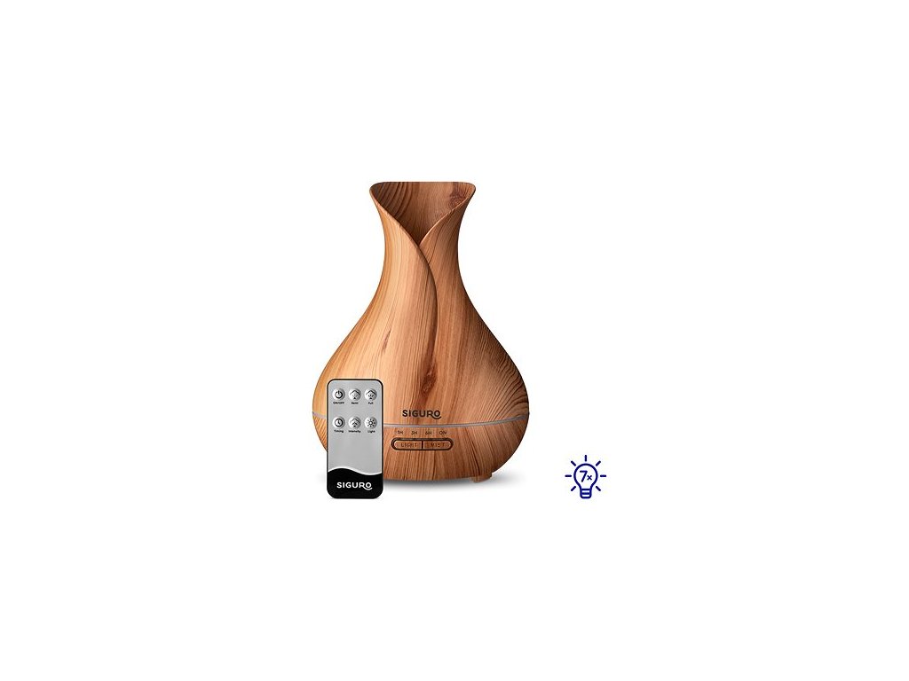 Aroma difuzér objem nádoby 400ml, výkon 12W, časovač, tichý provoz (<35dB), automatické vypnutí, 7 barev podsvícení, doporučená velikost místnosti 20-40m2, doba provozu až 10h, dálkové ovládání v balení, délka kabelu 180cm, 3 roky záruka Aroma difuzér Siguro AD-G400LW Silvery BlueNádherně si provoňte místnost, zlepšete náladu, zvlhčete vzduch a vytvořte útulnou atmosféru. To vše zvládnete pomocí jediného přístroje – aroma difuzéru Siguro AD-G400LW Silvery Blue v nádherné imitaci dřeva, který perfektně doplní jakýkoliv interiér. Přístroj lze používat v kombinaci s přírodními esenciálními oleji nebo samostatně s vodou jako zvlhčovač vzduchu a je vhodný pro místnosti o velikosti 20–40 m2. Mezi benefity aroma difuzéru zcela jistě patří velmi slušná doba provozu. Nádržka na vodu o objemu 400 ml totiž umožňuje zvlhčování až 10 hodin bez přerušení, dále oceníte tichý až neslyšitelný chod, díky čemuž vás nebude rušit při relaxování.Pohodlná obsluha tlačítky nebo dálkovým ovladačemPoužití aroma difuzéru Siguro AD-G400LW Silvery Blue je velmi snadné, stačí naplnit nádržku o objemu 400 ml vodou s esenciálním olejem a přístroj zapojit do elektrické sítě. Ovládání zajišťují dvě tlačítka. Pomocí tlačítka "MIST" nastavíte intenzitu a režim vypouštění páry – nepřetržitý chod či automatické vypnutí po jedné, třech nebo šesti hodinách. Tlačítko "LIGHT" poté slouží pro ovládání podsvícení, které je k dispozici v 7 různých barvách s možností úplného vypnutí. Pro ovládání difuzéru odkudkoliv můžete využít také dodávaný dálkový ovladač.Dva způsoby využitíFunguje s esenciálními oleji nebo samostatně s vodouJednoduché ovládáníAroma difuzér se ovládá tlačítky nebo dálkovým ovladačemPříjemné podsvíceníLze vybírat mezi 7 barvami a dvěma stupni intenzitySafe ProductPečlivě prověřený produkt, který je maximálně bezpečnýSiguro AD-G400LW Silvery Blue funguje i jako zvlhčovač vzduchuPokud však nebudete mít chuť ani náladu na aromaterapii, lze difuzér Siguro AD-G400LW Silvery Blue využít i jako zvlhčovač vzduchu s výkonem až 45 ml/h. V zimních měsících se totiž často objevuje problém se suchým vzduchem, který vzniká topením v místnosti. Difuzér dokáže zvláčnit suchý vzduch a vytvořit tak příjemné prostředí. Vytvořte si příjemnou a útulnou atmosféru pro pohodový odpočinekObjem vody (400 ml) postačuje až pro 10 hodin provozu. Aroma difuzér Siguro AD-G400LW Silvery Blue disponuje praktickým podsvícením, které můžete nastavit v 7 různých barvách a 2 intenzitách, jednoduše tak vytvoříte ideální atmosféru pro relaxování. Samozřejmostí je funkce automatického vypnutí v případě, že v nádržce dojde voda. Součástí balení je napájecí adaptér, nádobka pro bezproblémové doplňování vody a dálkové ovládání, včetně baterie. Výhody:Krásně provoní pokoj7 barev podsvícení s možností úplného vypnutíJednoduché ovládání pomocí dvou tlačítekDálkový ovladač pro snadné ovládání odkudkolivČasovač a možnost nastavení intenzityBezhlučný provozFunguje i jako zvlhčovač vzduchuFunkce automatického vypnutí v případě, že dojde v nádržce vodaStylové provedení v imitaci dřevaVlastnosti:Objem nádržky na vodu: 400 mlDoporučená velikost místnosti: 20–40 m2Výkon zvlhčování: 30–45 ml/hHlučnost: <35 dBDoba provozu: až 10 hodinMateriál: ABS a PPRozměry: 170 × 170 × 227 mmDélka kabelu: 180 cmVýkon: 12 WProč vsadit na Siguro?Značka Siguro nabízí designově sladěné produkty, které vám dovolí vkusně zkombinovat vybavení domácnosti. Vše vyrábíme v certifikovaných, auditovaných továrnách, kde je zaručena kvalita i lidský přístup. Záleží nám také na vašem pohodlí, za každý kus ručíme prodlouženou zárukou na 3 roky a v případě potíží s produkty Siguro se můžete spolehnout na rychlou výměnu přímo na pobočkách.Každý produkt nabídne něco navícGarantujeme okamžitou výměnu na pobočkáchZískáte nadstandardní záruku prodlouženou na 3 rokyVyrobeno pouze v ověřených a kontrolovaných továrnáchDoplňkové parametry