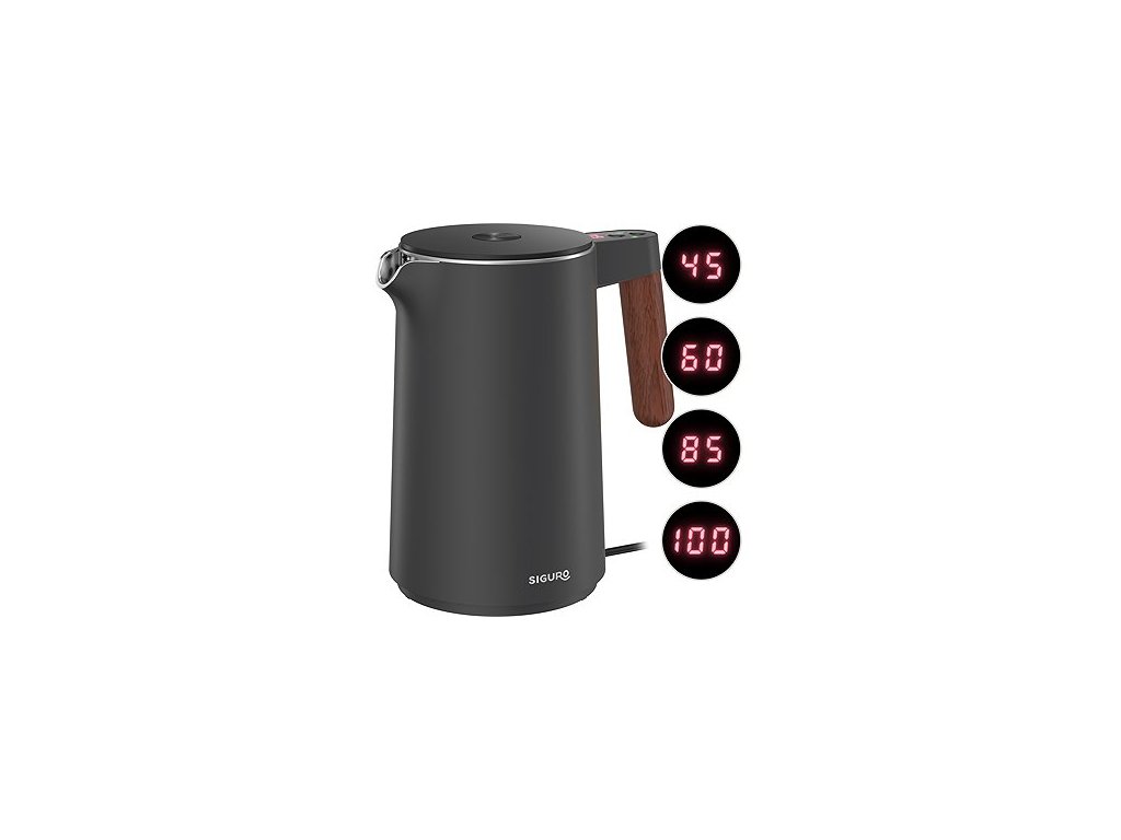 Rychlovarná konvice - s regulací teploty, 7 přednastavených teplot (45, 60, 70, 85, 90, 95 a 100 °C), objem 1,5 l, příkon 2 200 W, britský Strix konektor s životností více než 12 000 použití, 360° otočná základna s prostorem pro kabel, materiál nerezová ocel, dvojitý plášť (Cool Touch), funkce udržování teploty (až 8 hodin), zajištění víka, automatické vypnutí při nedostatku vody a dosažení nastavené teploty, skrytá topná spirála, antidrip víko, délka kabelu 70 cm, 3 roky záruka Rychlovarná konvice Siguro Mackay C750DYElegantní rychlovarná konvice Siguro Mackay C750DY o objemu 1,5 litru nabízí možnost nastavení cílové teploty, britský Strix konektor s dlouhou životností, dvojitý plášť (Cool Touch) či kvalitní materiály. U tohoto modelu si můžete nastavit teplotu již od 45 °C a lze tak využít pro přípravu celé řady teplých nápojů. Samozřejmostí je automatické vypnutí po dosažení bodu varu, funkce udržování teploty, ochrana proti chodu naprázdno či praktická 360° otočná základna s úložným prostorem pro kabel. Se svým elegantním provedením s rukojetí v imitaci dřeva se konvice stane zajímavým designovým doplňkem každé moderní kuchyně. Dvouplášťové provedeníVnější i vnitřní plášť rychlovarné konvice Siguro Mackay C750DY je vyroben z vysoce kvalitní a zdravotně nezávadné nerezové oceli 304, která nezachytává pachy ani příchutě, a to bez ohledu na četnost používání. Dvojitá stěna zajišťuje, že povrch zůstává i při varu chladný, takže nehrozí popálení vám ani dětem. Skrytá topná spirála pod dnem je chráněna před usazováním vodního kamene, což prodlužuje její životnost a díky použitým materiálům se konvice velmi snadno čistí. Britský Strix konektor Testovaný na více než 12 000 použití pro dlouhou životnost a spolehlivost. Nerezová ocel Použitý materiál neobsahuje škodlivé látky a je zdravotně nezávadný, navíc se snadno čistí. Otočná základna 360° otočná základna ulehčuje a zrychluje manipulaci s konvicí. Antidrip víko Díky speciálnímu provedení stéká zkondenzovaná voda zpět do konvice. Cool Touch Dvouplášťové pro bezpečné používání bez popálení. Automatické vypnutí Při dosažení bodu varu se konvice automaticky vypne. Bezpečnostní ochrana Konvice disponuje bezpečnostní funkcí proti chodu naprázdno. Udržování teploty Udrží vodu ohřátou na danou teplotu až 8 hodin. Ohřívá vodu na přesně zvolenou teplotuVýchozím nastavením rychlovarné konvice Siguro Mackay C750DY je ohřev na 100 °C. Pokud budete potřebovat zvolit jinou teplotu, stačí použít příslušné tlačítko na rukojeti a nastavit požadovanou teplotu – 45, 60, 70, 85, 90, 95° nebo 100 °C. S touto konvicí tak můžete připravovat například nápoje, které nevyžadují vroucí vodu (různé druhy čajů či kávy) či dětské pokrmy. Aktuální teplota v konvice se zobrazuje na displeji umístěném na vrchu rukojeti. Funkce udržování teplotyTuto funkci jednoduše aktivujete tak, že nastavíte teplotu příslušným tlačítkem, následně stisknete tlačítko pro udržování teploty a spustíte ohřev. Jakmile se voda ohřeje na zvolenou teplotu, konvice Siguro Mackay C750DY se automaticky přepne do režimu udržování teploty. Maximální doba režimu udržování teploty je až 8 hodin dle zvoleného režimu a nelze zvolit pro 100 °C. Strix konektor – srdce bezpečné a spolehlivé konviceStrix konektor patří mezi nejspolehlivější a nejbezpečnější řešení pro rychlovarné konvice. Díky propracovanému systému nabízí ochranu proti přehřátí, delší životnost a vysokou úroveň bezpečnosti, kterou běžné konektory často nemohou zaručit. O kvalitě svědčí nejen přísné testování, ale i každodenní používání miliony lidí po celém světě.Bezpečnost – Dva nezávislé senzory doplněné chrání před přehřátím při nedostatku vody, funkce LOSO konvici vypne při špatném dosednutí na základnu.Odolnost – Testováno na více než 12 000 cyklů, což je několikanásobně více, než se běžně vyžaduje.Materiály – Použití kvalitních bimetalických součástek (bez koroze a s dlouhou životností)Udržitelnost – Díky efektivnímu řízení páry a teploty pomáhá snižovat emise a šetřit energii. Chytré detaily, které šetří čas i místoRychlovarná konvice Siguro Mackay C750DY je vybavena ukazatelem hladiny vody na vnitřní straně nádoby, takže vždy přesně budete vědět, kolik vody vaříte. Díky 360° otočné základně můžete konvici umístit z jakéhokoli úhlu. Integrovaný prostor pro uložení kabelu zajistí, že kabel nebude na kuchyňské lince zbytečně překážet. Pohodlí a čistota při každém použitíPohodlné nalévání vody do šálků usnadňuje optimálně tvarovaná výlevka konvice. Rychlovarná konvice Siguro Mackay C750DY také disponuje antidrip víkem – při varu se na vnitřní straně sráží pára a díky speciálním výstupkům se kapky vody shromažďují a stékají zpět do konvice, místo aby voda při otevření víka vytekla ven. Víko lze otevřít až do úhlu 85°, což usnadňuje nalévání vody nebo případné čištění. Klíčové vlastnostiElegantní design s rukojetí v imitaci dřevaDvouplášťové provedení z nerezové oceliVysoce kvalitní nerezová ocel 304, která je zdravotně nezávadná a nepohlcuje pachy a chutěMožnost...Doplňkové parametry